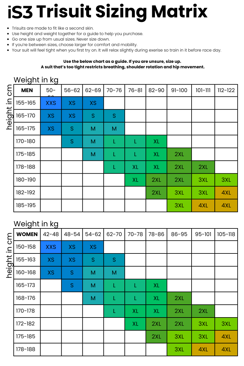 Tri suit sizing matrix